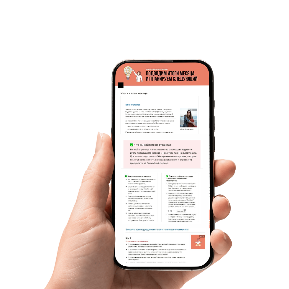 Почніть знайомство з моїм підходом та платформою Notion із простого та корисного інструменту – шаблону для підбиття підсумків місяця. Він включає коучингові питання для рефлексії та планування.